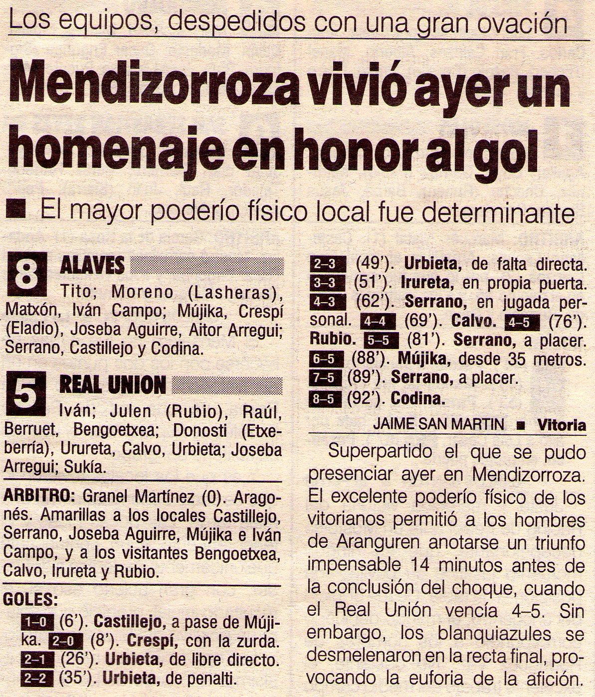 Uno de los partidos que quedan para siempre en la memoria fue un Alavés - Real Unión, un duelo de Segunda B similar al que vamos a vivir este sábado. Recupero de twitter la imagen de una crónica del choque, vibrante, en el que un soberbio Urbieta puso, a balón parado, al Glorioso al borde del colapso. A falta de menos de un cuarto de hora, los albiazules perdían ante un sólido Real Unión. Sin embargo, la aparición de algunos hombres llamados a ser historia albiazul -Serrano, Codina, Musti Mujika- colocando cuatro goles en once minutos a los fronterizos, acabó dando la vuelta a un choque insólito, vibrante, inolvidable...